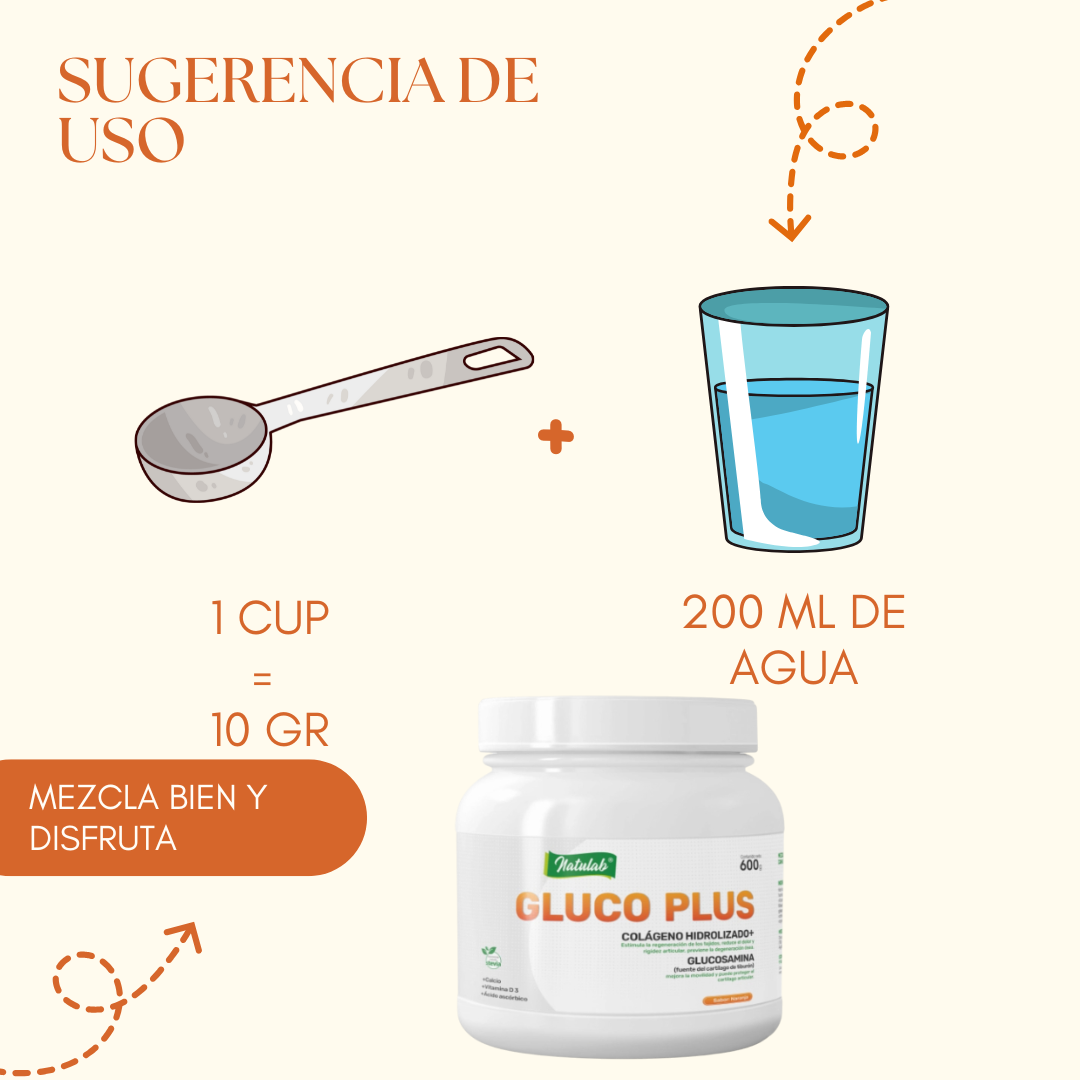 Gluco Plus 600 gr con colágeno hidrolizado y glucosamina, ayuda a regenera cartílagos, reduce dolor e inflamación y mejora la movilidad articular. Sabor naranja.