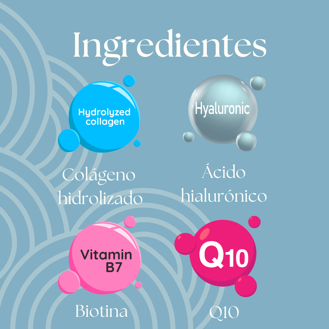 - Colágeno hidrolizado + Ácido Hialurónico + Biotina + Q10
